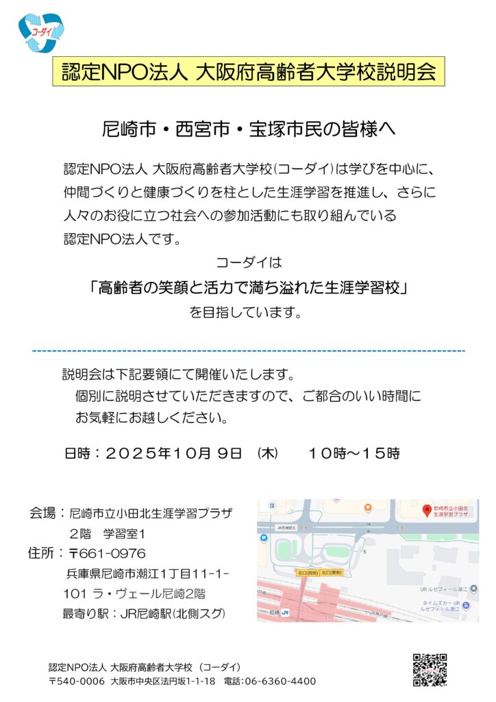 10月9日 尼崎市で 『認定NPO法人大阪府高齢者大学校説明会』 を開催します