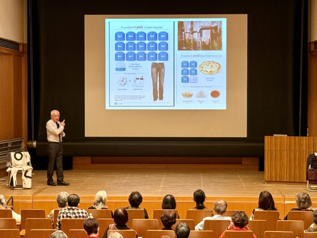 京都工芸繊維大学名誉教授の木村照夫氏をお迎えし、「古着廃棄物の実態」「サーキュラーエコノミー(1.自然のシステムの再生 2.製品と原料材を捨てずに使い続ける 3.ゴミ・汚染を出さない設計)の必要性」「つくる責任、使う責任」など、古着を中心とした繊維製品の循環についての講演をしていただきました。 衣類は捨てるのではなく、循環させることが重要。そのためには、まずは衣類を長持ちさせること、そして、効果的、効率的回収システムの構築が必要との認識を改めて実感しました。